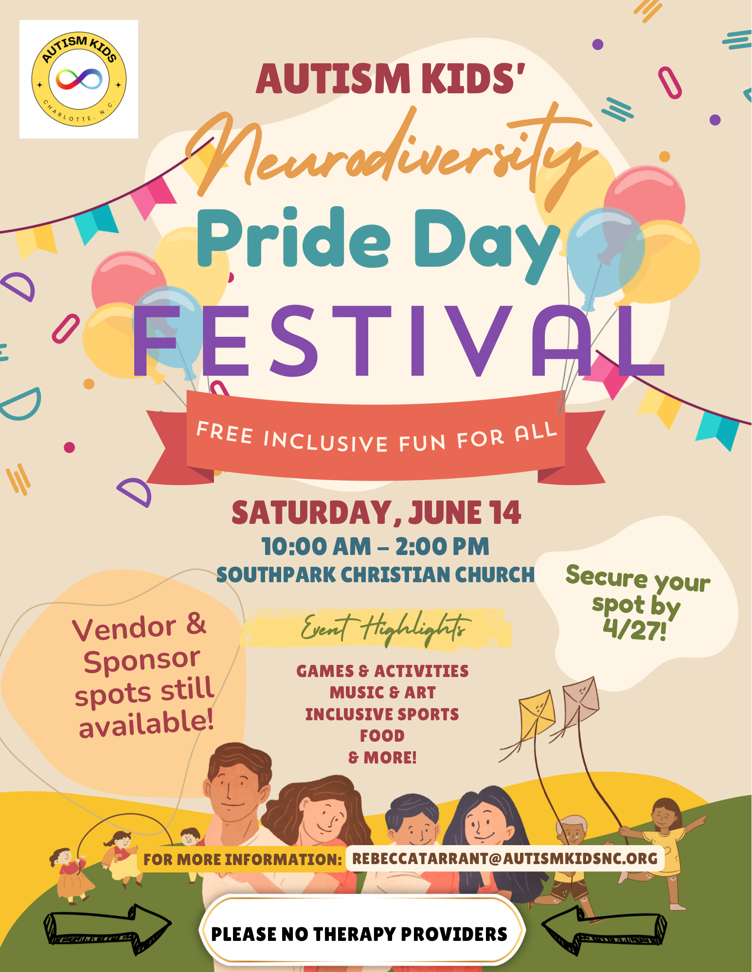 Join us for Autism Kids’ 3rd Annual Neurodiversity Pride Day Festival 2025 this June in SouthPark! This free, sensory-friendly and inclusive festival has something for everyone - come celebrate minds of all kinds!